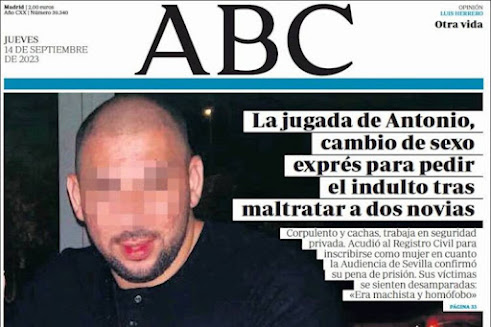 Dejando en un segundo plano la manifestación convocada por Alberto Núñez-Feijóo contra una eventual amnistía del procés, el diario ABC ha decidido dedicar hoy su portada a Antonio, un hombre condenado por violencia de género en Sevilla que, según nos cuentan, ha decidido solicitar el cambio de sexo registral y pedir un indulto al Gobierno para no entrar en prisión.